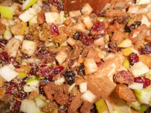 Put: 700g of your preferred dried fruit, 100g mixed peel, 1 cooking apple, 125g butter/suet/cacao butter, 50g chopped almonds, 225g brown sugar, spices to taste (cinnamon, nutmeg, ginger, mixed spices), and the juice and rind of a lemon or lime in a big saucepan and heat gently until the butter/suet is melted. Simmer very gently for about 10 minutes.