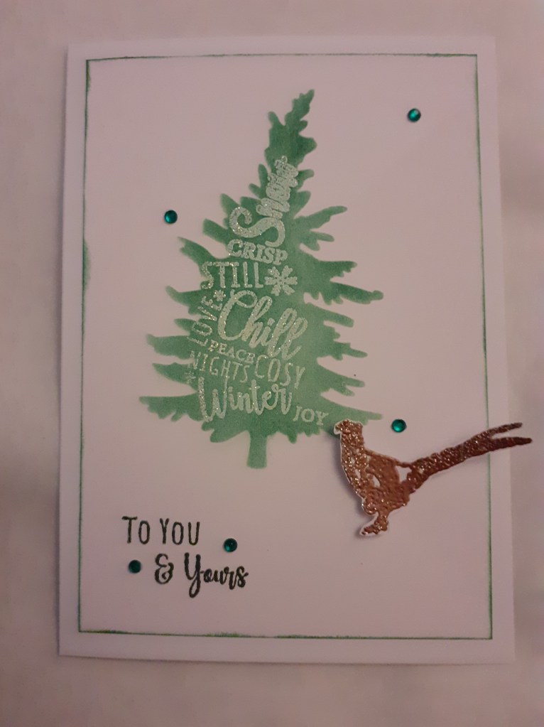 These were very simply done, with the word stamps heat-embossed in white before inking over with the stencils and daubing around the edge of the card-front with the same colour. The pheasant was heat-embossed in copper and then fussy-cut. That was the trickiest bit of the whole thing, but I think I’m getting the hang of fussy-cutting. And heat-embossing, if it comes to that.