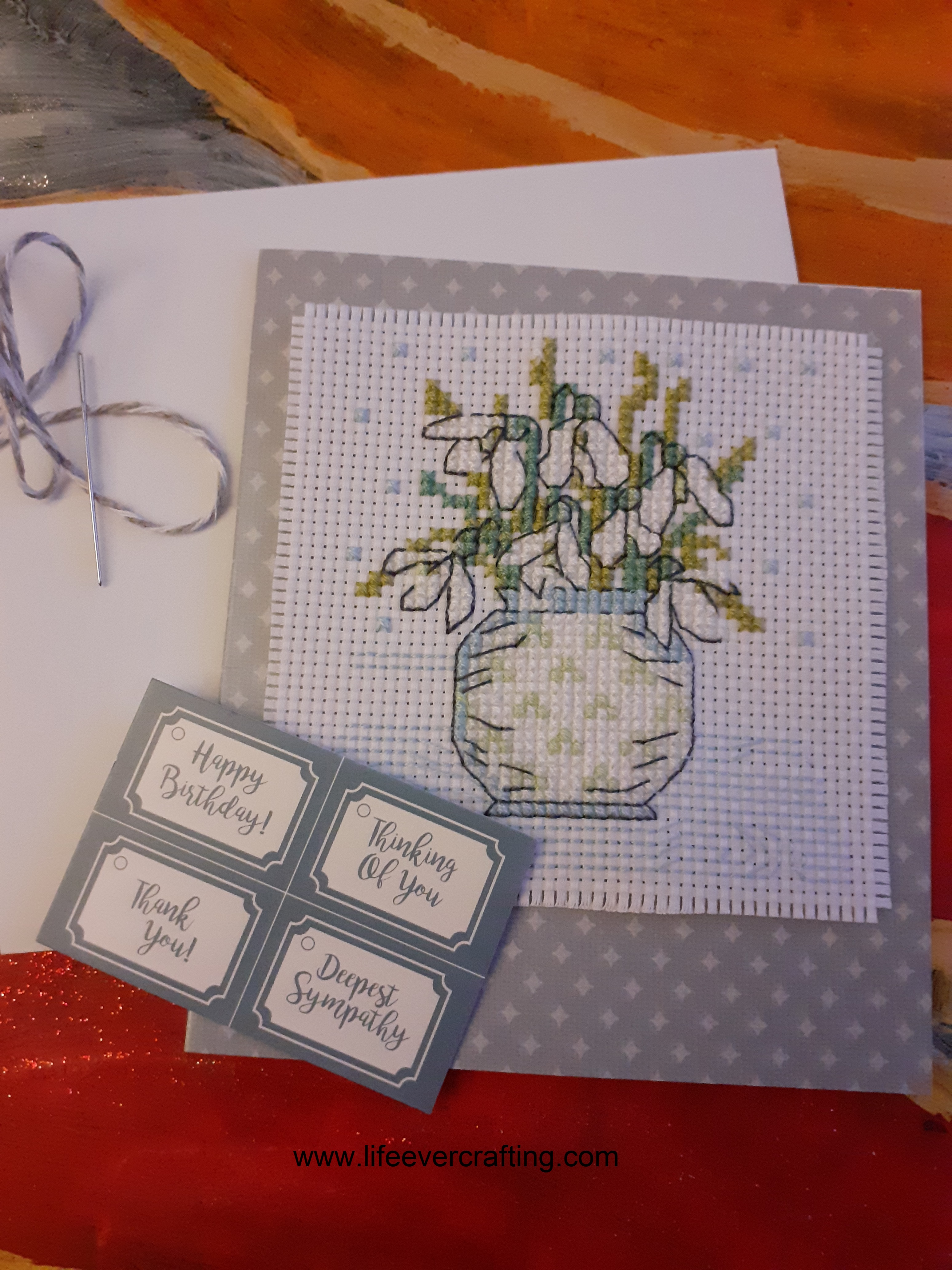 I don’t think I’ve seen any snowdrops out in the wild yet, though. I’ve had to content myself with the ones I make, first the die-cut ones last week, and now this vase of cross-stitched ones.