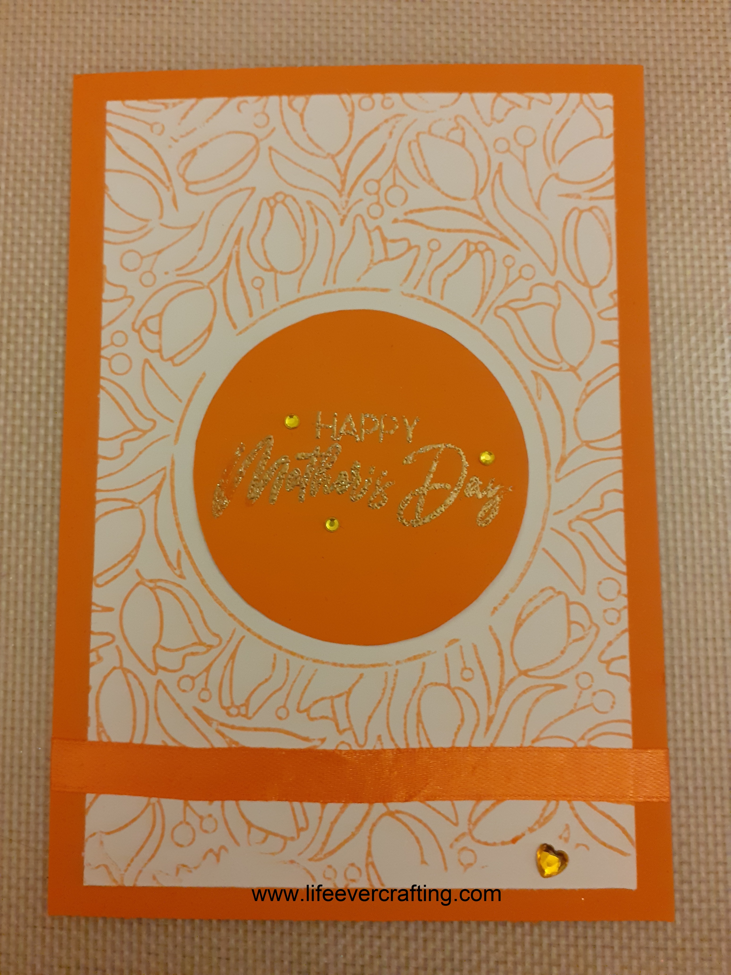 Not having circle nesting dies, I dug out a pair of compasses to draw a circle the right sort of size and carefully cut it out. And after all the fussing with embossing folder I decided to forgo playing with the tulip dies which came with the set, and just heat-embossed the sentiment and sprinkled gems.