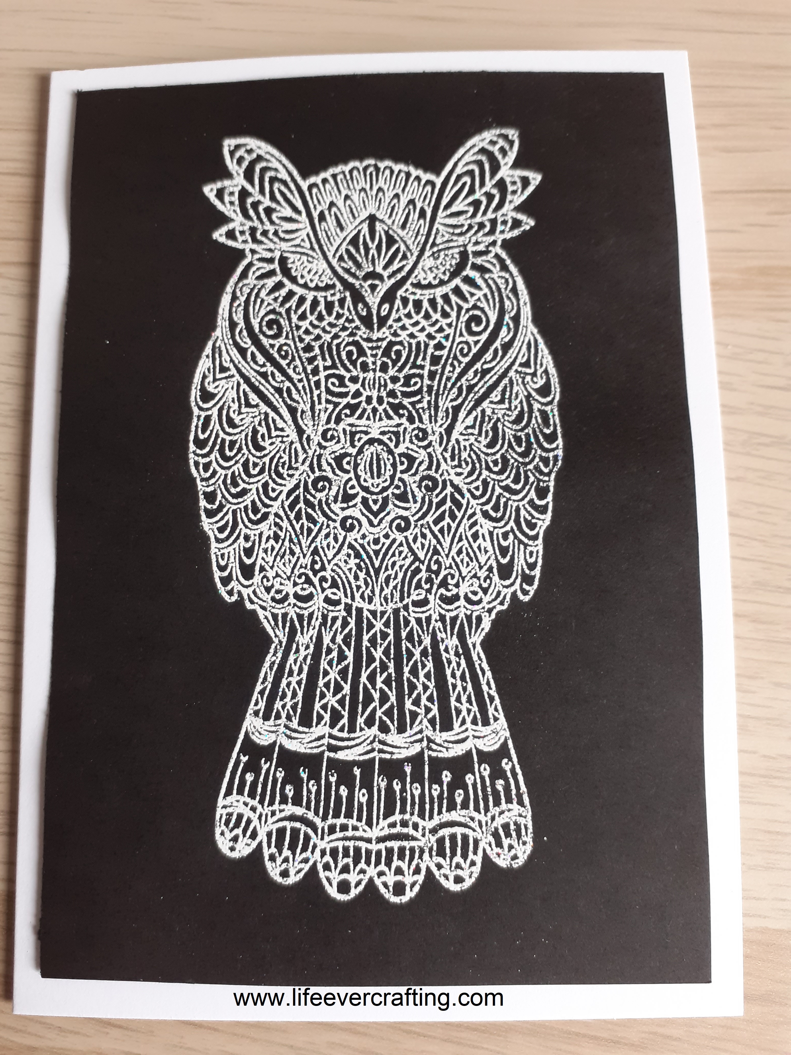 This time, I used the owl. Still with the white heat-embossing on black, though. And kept simple, without even the odd gem to give it more sparkle.
