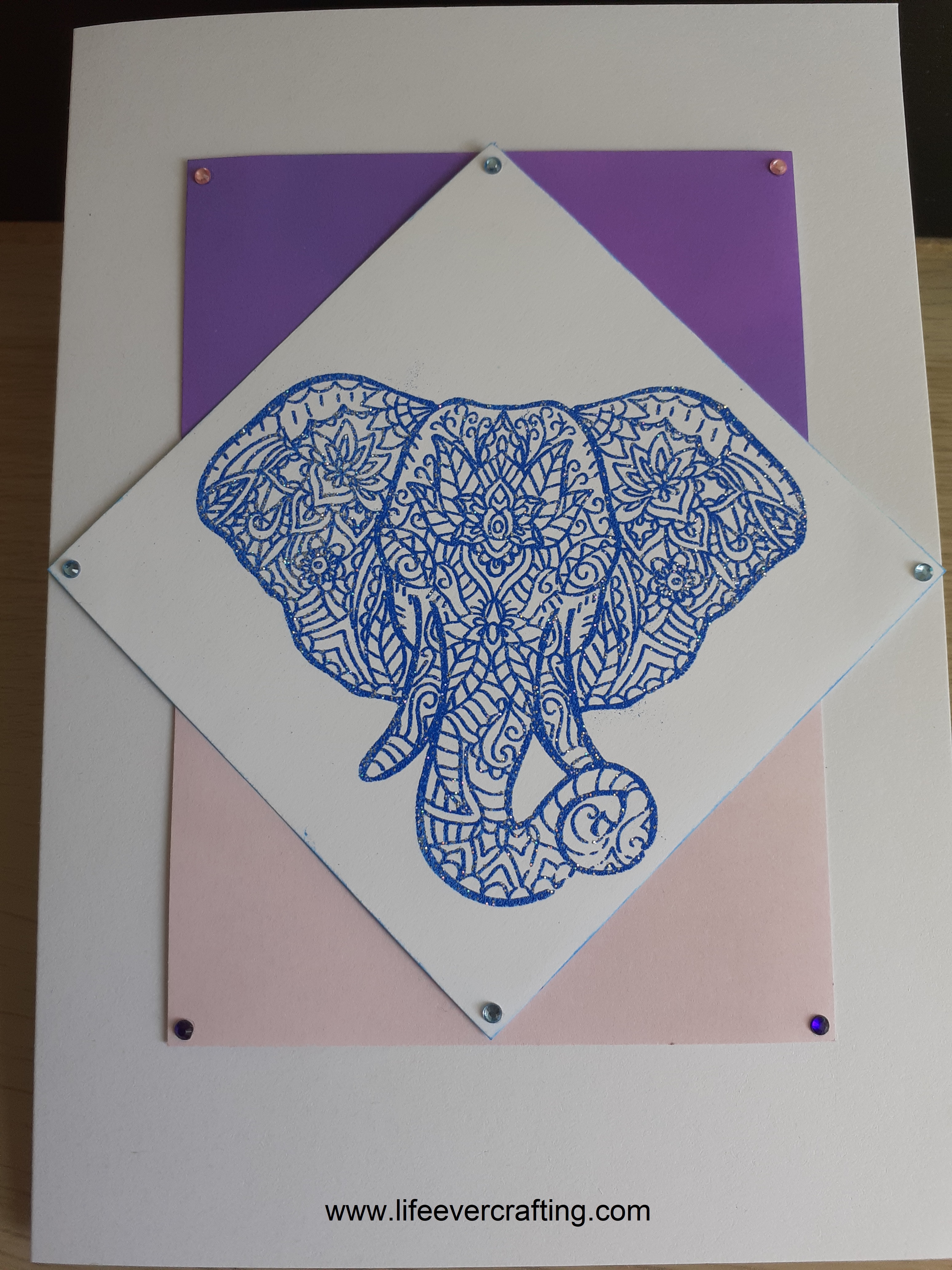 This time for the elephant I did blue ink/embossing powder on white. I gave it a purple-blended background, and sprinkled some blue, pink and purple gems. Again, no sentiment as yet.