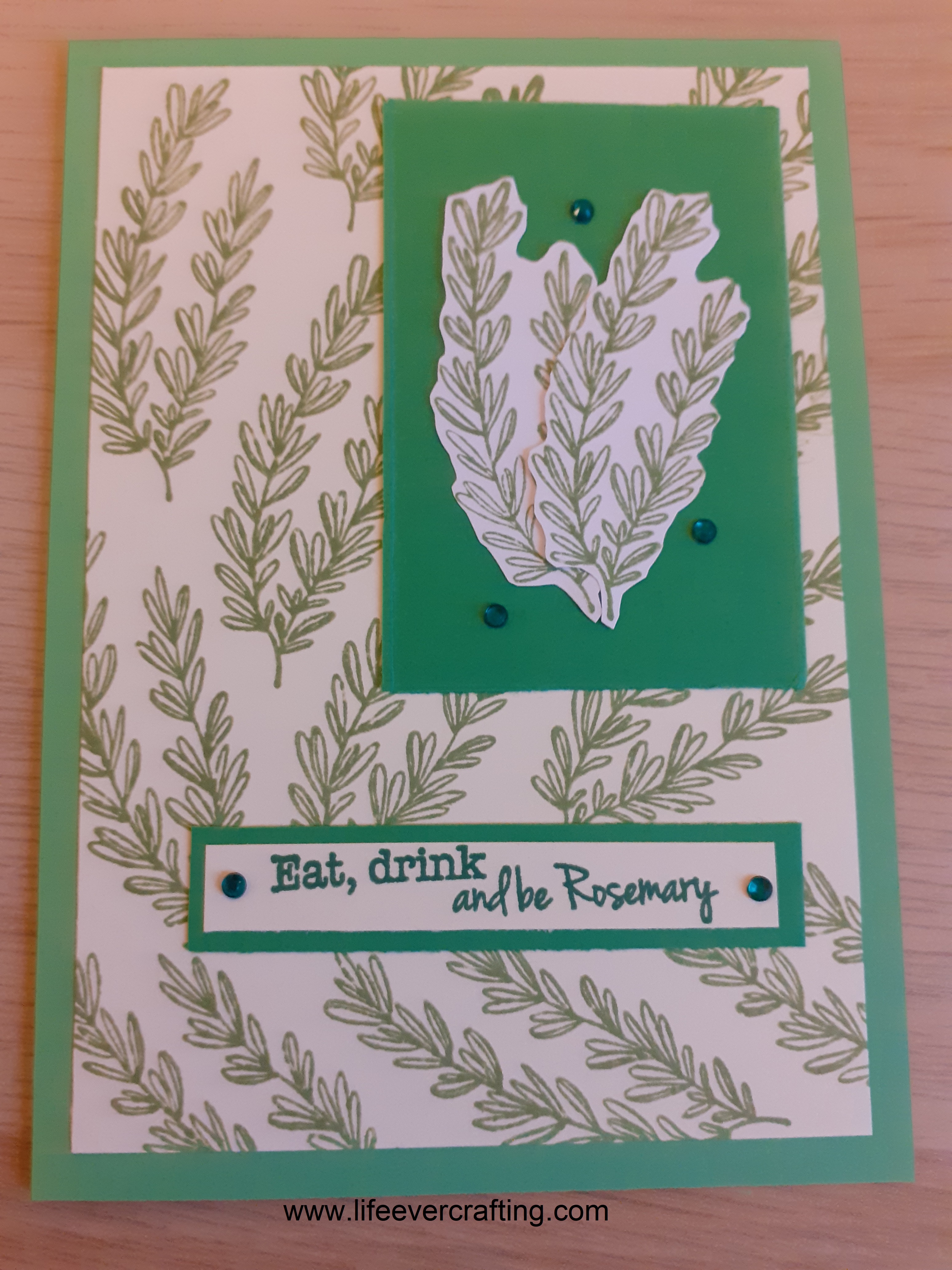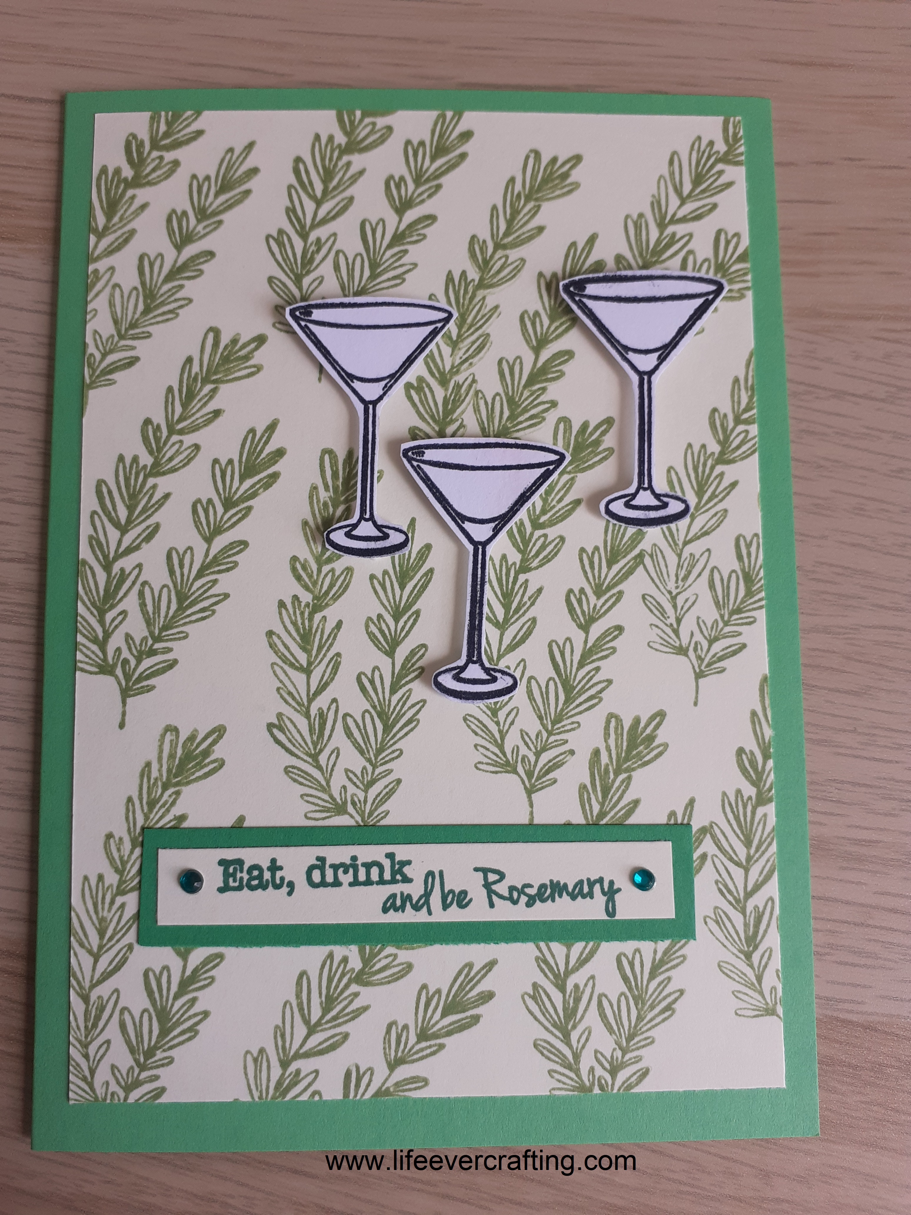 In the meantime, I had a play with the rosemary-sprig stamp for some backgrounds, and the sentiment Eat, drink and be rosemary. But the cards needed something else, so some fussy-cut sprigs and cocktail glasses were called upon, along with a sprinkling of green gems.