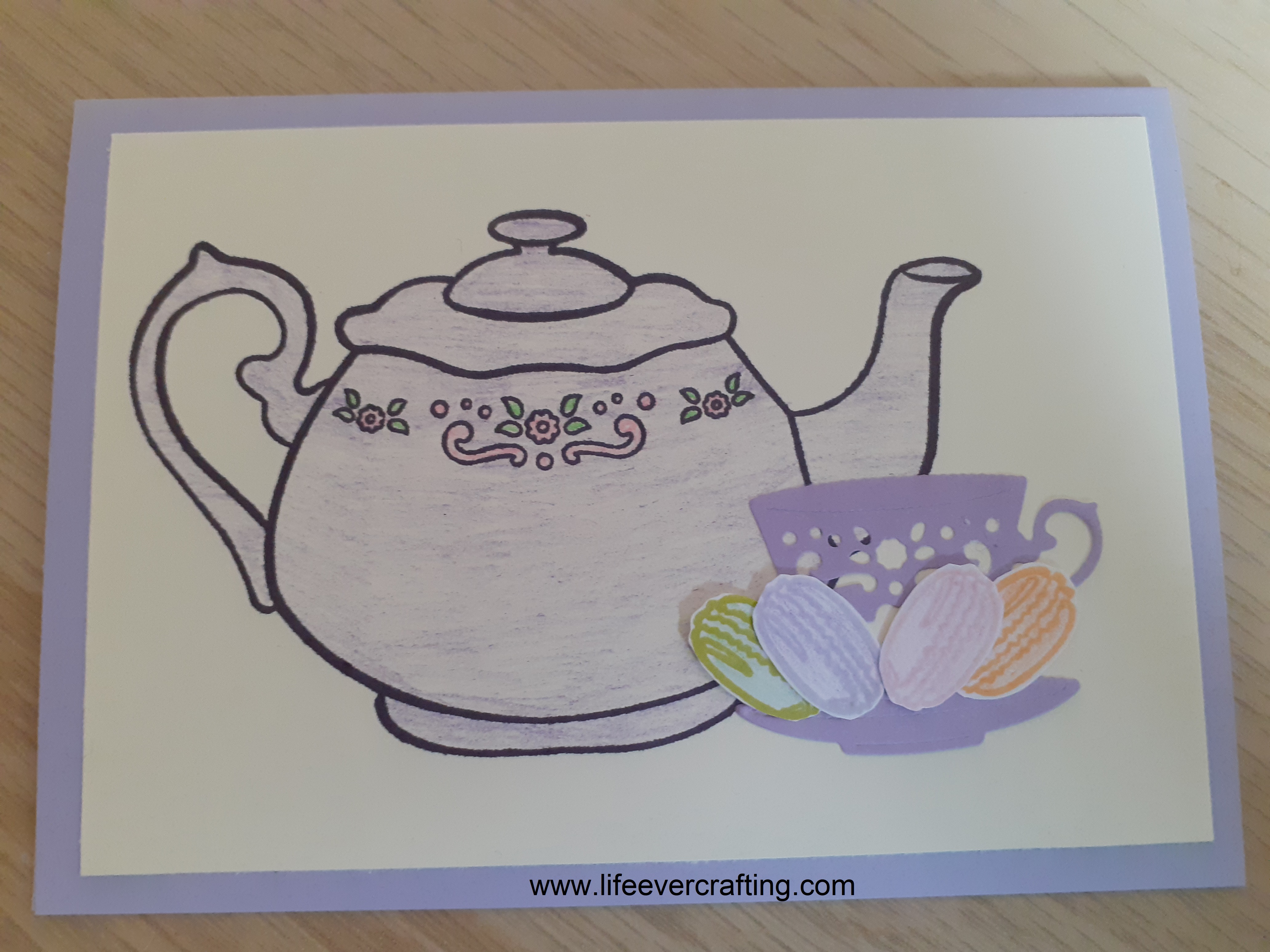 Anyway. This was a very simple sort of card: the teapot was stamped in Memento (Blackberry, I think it was) and coloured with pencils, and the tea-cup cut using the accompanying die. The macarons were stamped (also in Memento), coloured, and fussy-cut.