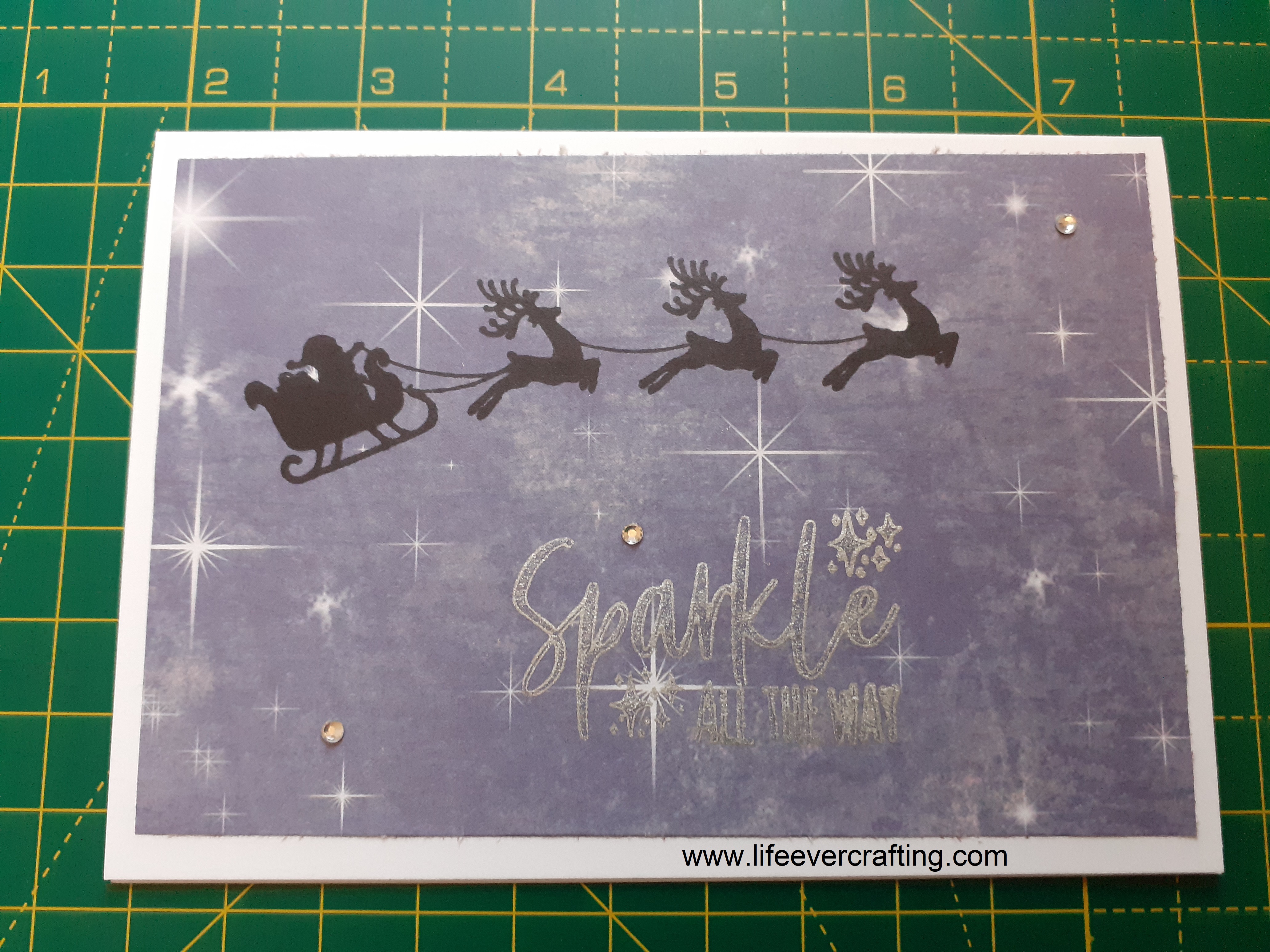 Again, the sleigh and reindeer, stamped in black (Stazon), were part of the freebie from Creative Stamping 100, from the Father Christmas-themed quarter of stamps. The paper came from the Christmas Nights paper pack by Tattered Lace which came with Papercrafter 139 and which I did nothing with when I got it. This happens a lot with paper packs from magazines.