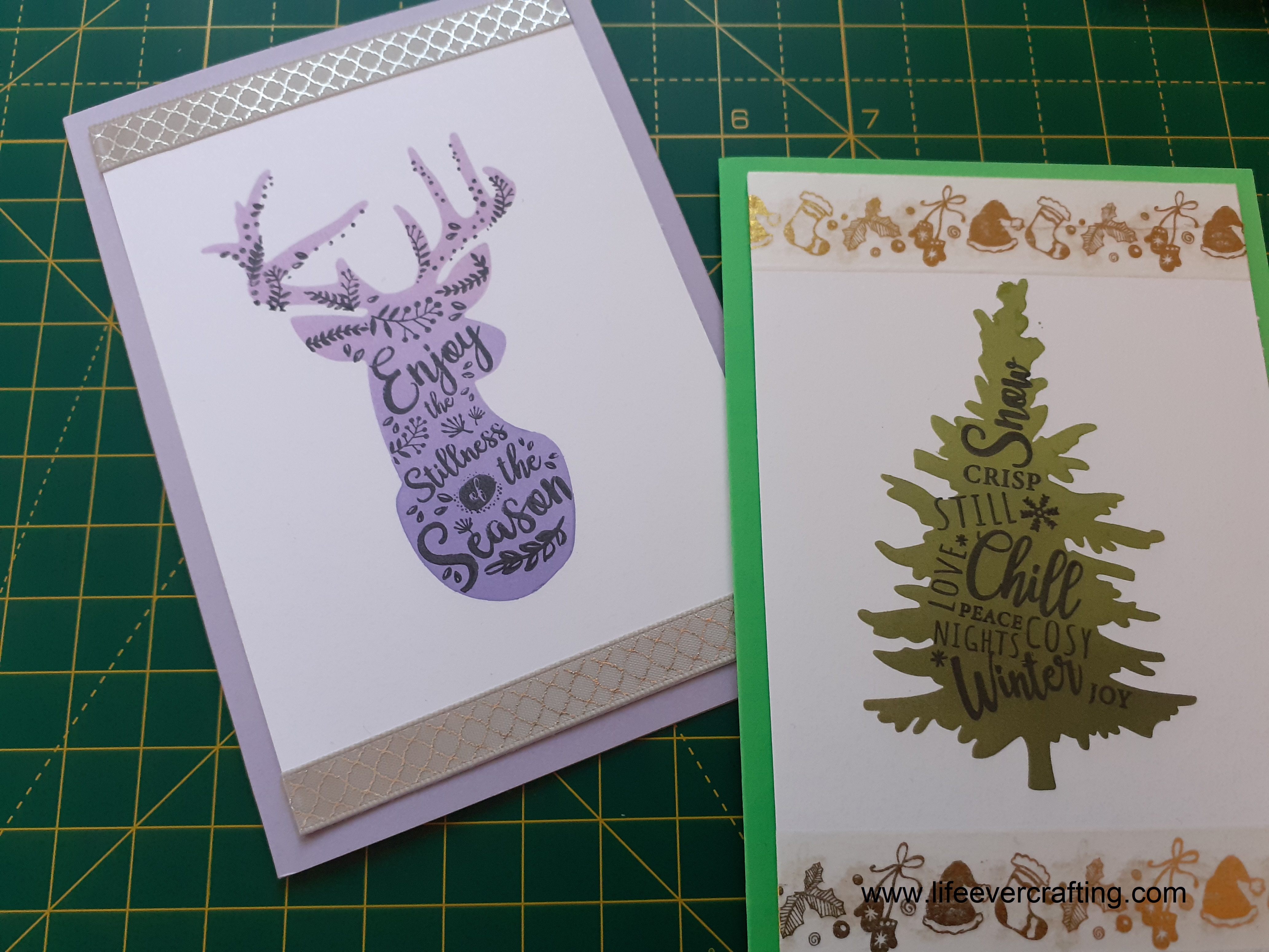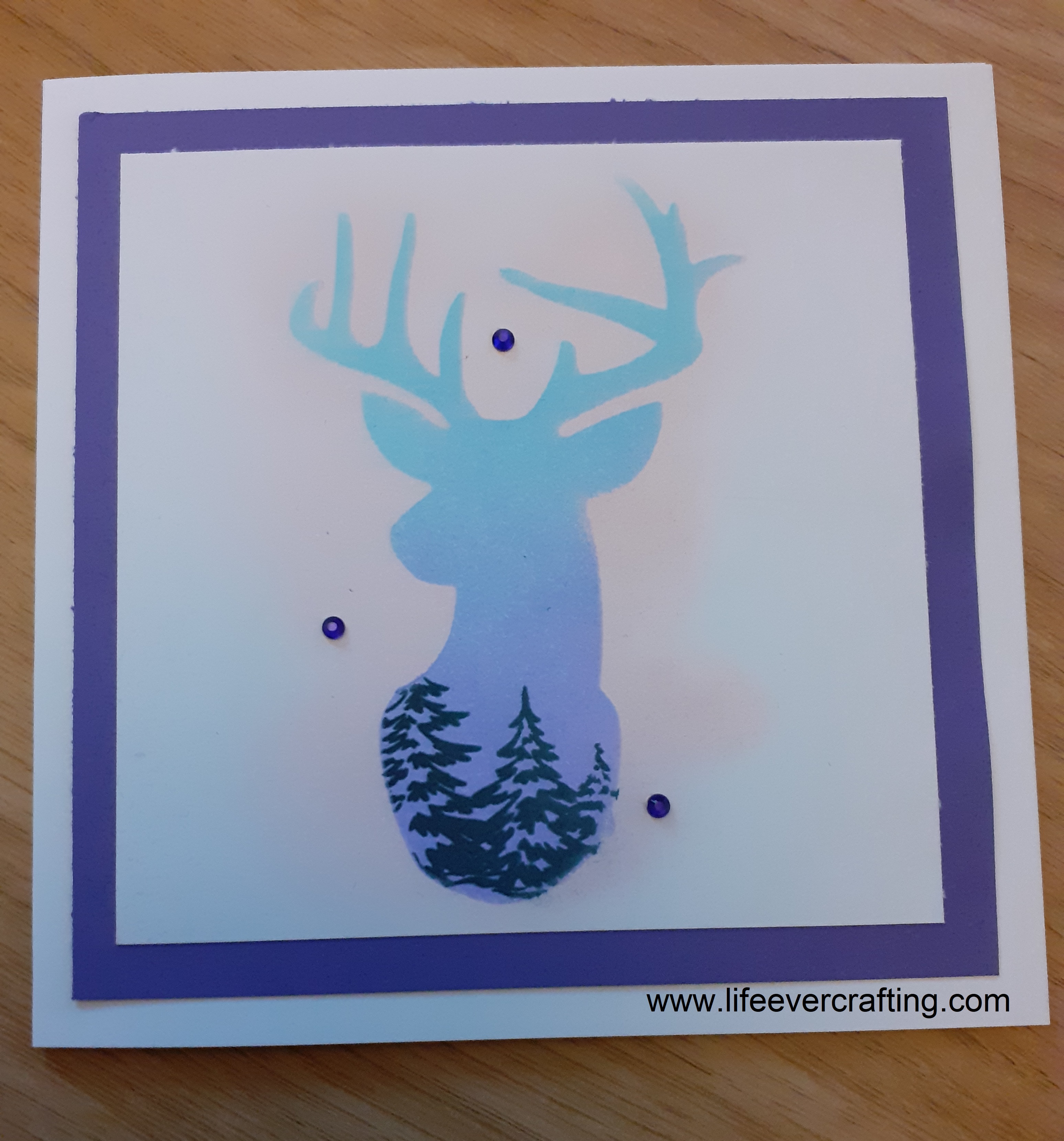 Then there are the variations with shades of blue and purple and scenes stamped across the bottom: trees for the stag and a deer family for the tree. A light dusting of pink and a sprinkle of gems, and, later, probably a sentiment. The earlier attempts with Distress Oxide inks did not go as well as intended. I prefer using VersaMagic.
