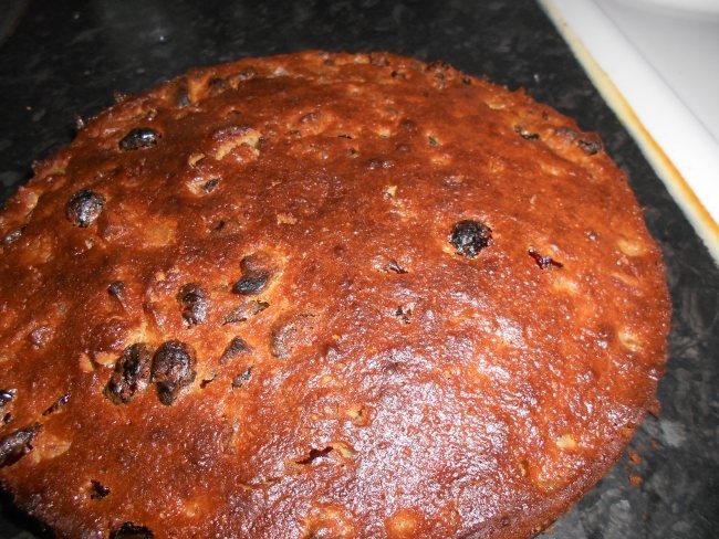 What you do is you take your preferred sponge cake recipe – the Victoria sponge works well – and you stir in your preferred quantity and mix of dried fruits. If you think about it ahead of time, soak the fruits in the alcohol of your choice overnight. Or for an hour or two before baking. Add spices to taste and bake until it looks done, usually 30-40 minutes, at about 180C (or whatever your sponge recipe calls for).