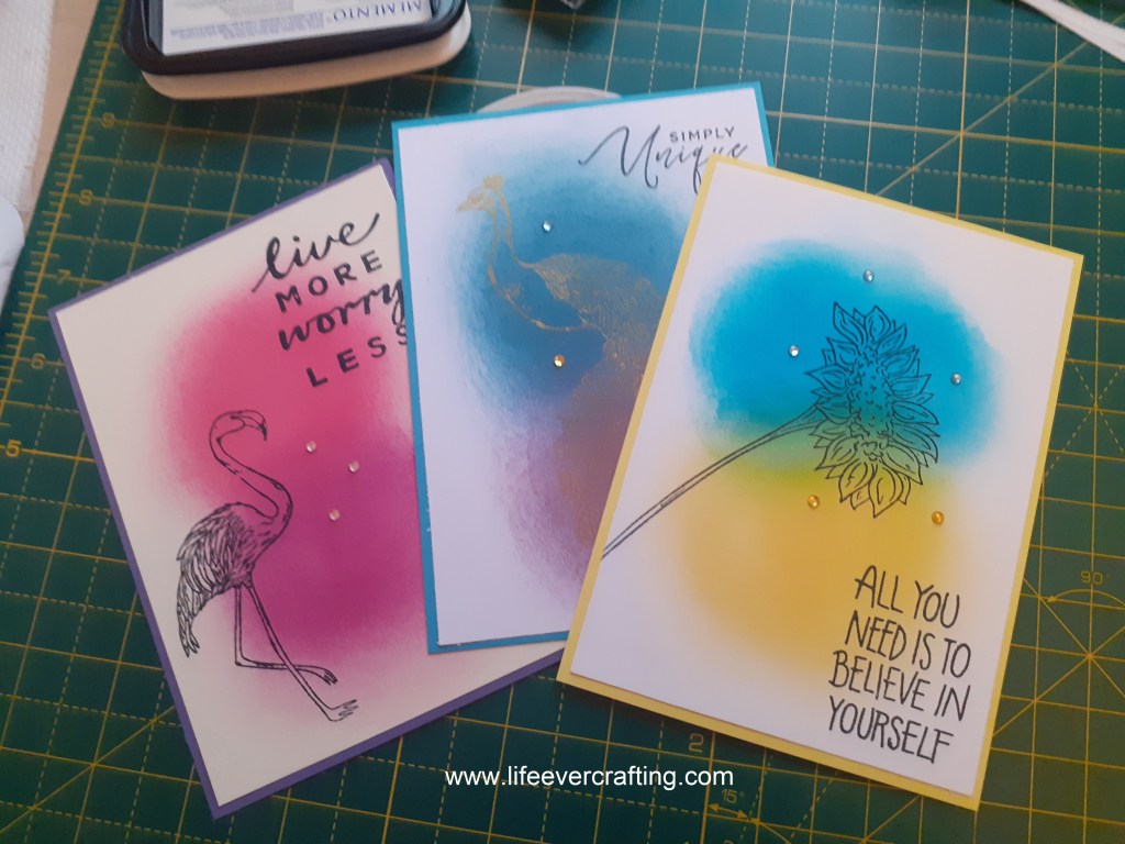 And so, recently, I seem to have been making Themes and Variations on a basic card idea, as shown by the Flamingo the other week: A bit of blending, a focal image, and a nice sentiment. And a sprinkling of sparkly gems.