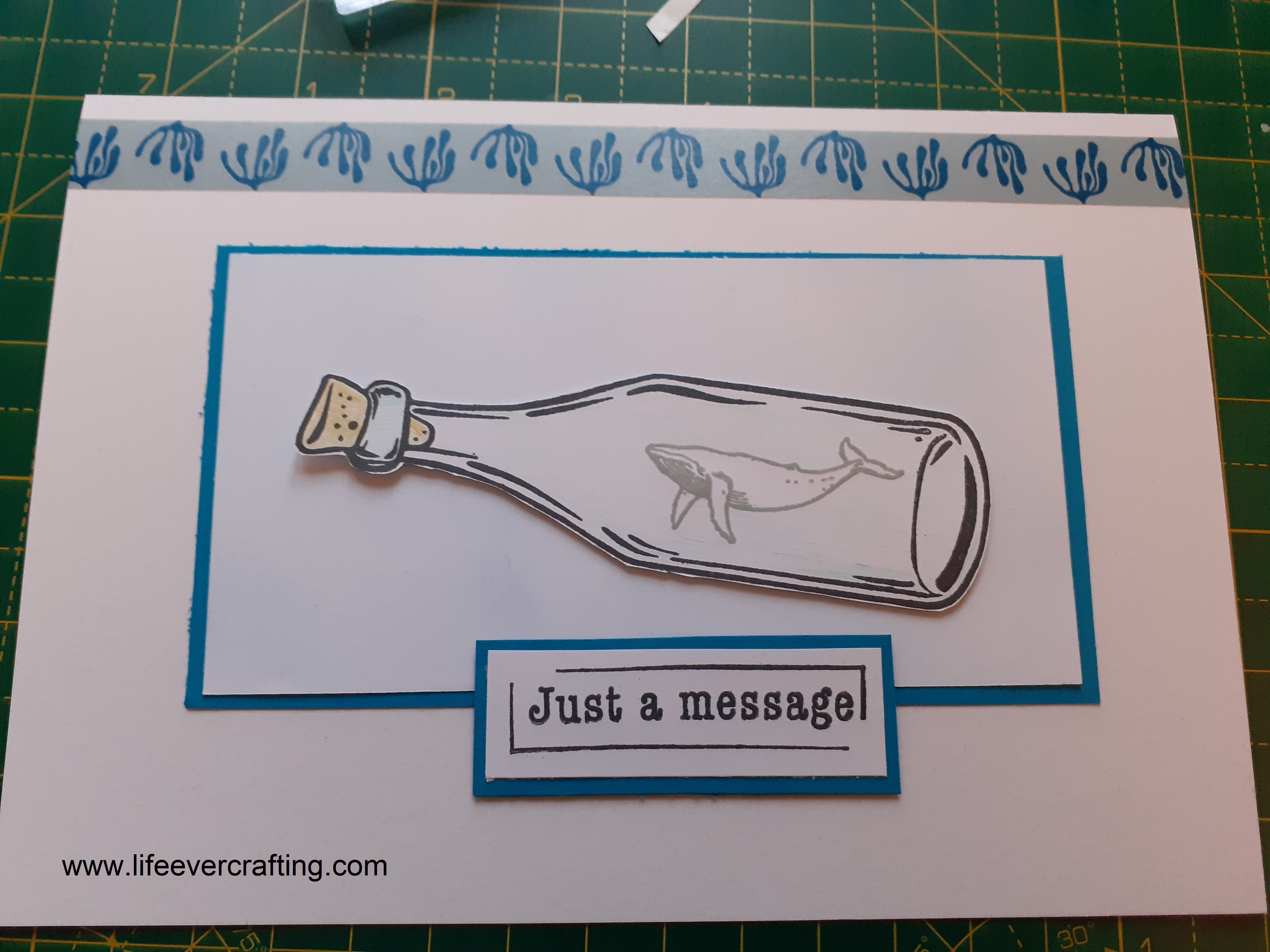 In the meantime, though, I’ve been playing with the Lisa Norton Message in a Bottle stamp set which came with Creative Stamping 95. I even used one of the projects (designed by Ruth Hamilton) for inspiration. Not quite the same: I don’t have much in the way of baker’s twine in my craft room, or Aqua Flow markers.