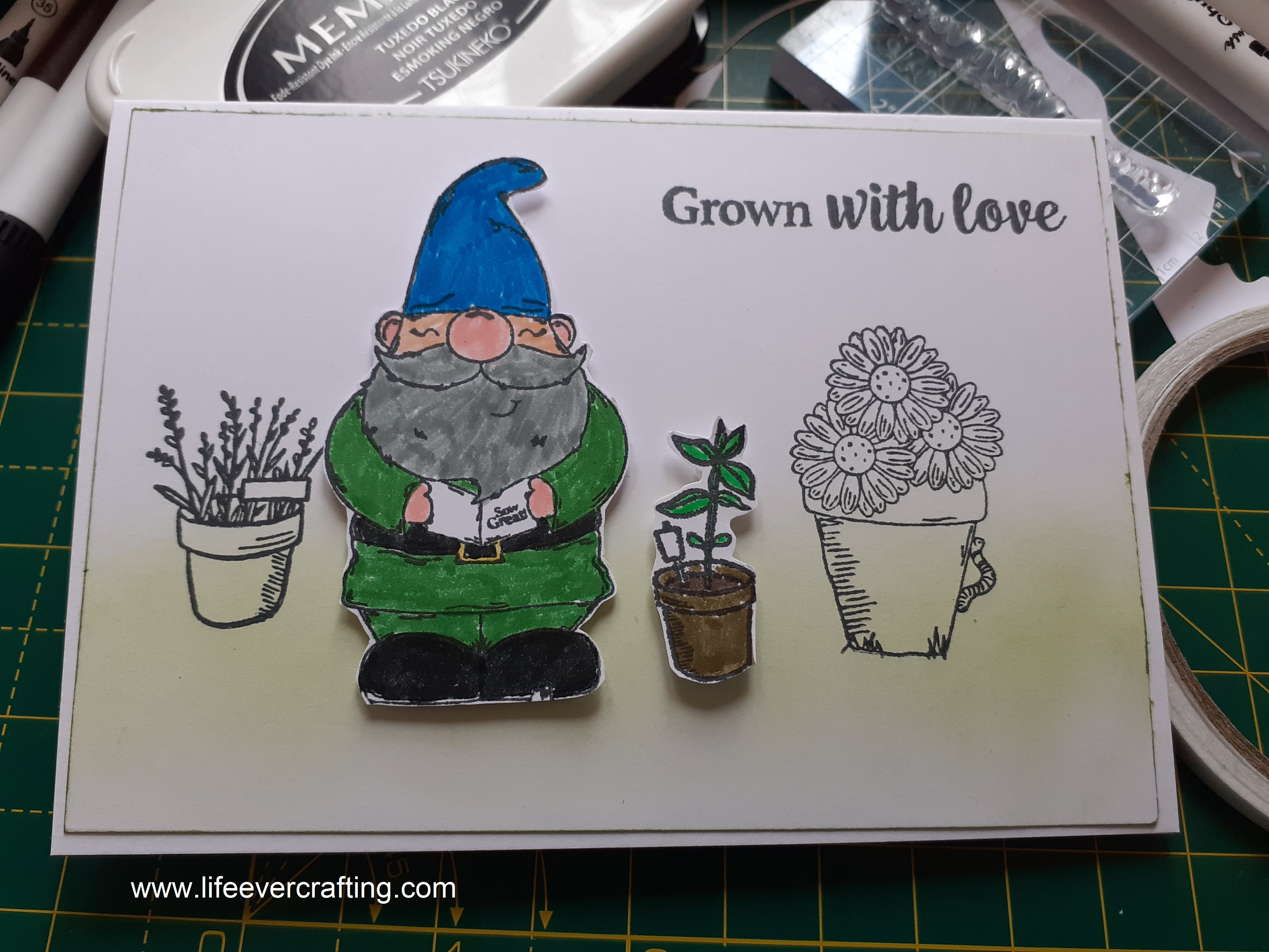 But the Daisy Mae Garden Gnome stamp set from Creative Stamping 94 does lend itself to the gardening men I know. Which is useful, as I’d otherwise been struggling to think of something to make for M. Could have done something with some of the birds, I suppose, but given my general lack of inspiration and energy recently (I still haven’t tidied my desk yet), that seemed a bit complicated.