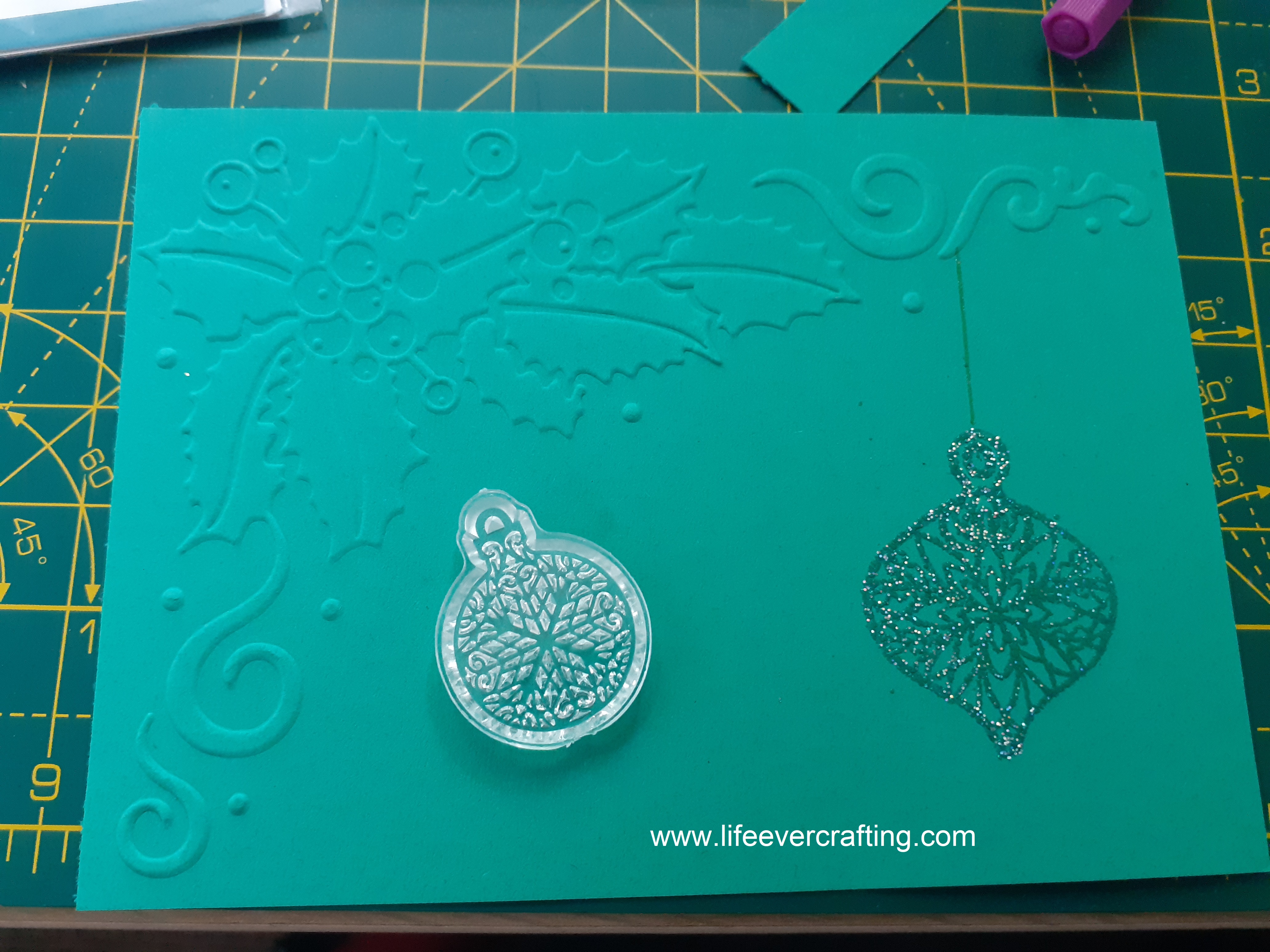 I did try a green-embossed sentiment – May your season sparkle – but the stamp I have of it doesn’t really work with embossing powder, so I shall have to have another think about that. In the meantime, I think another of the baubles will be a good idea. Still in green.