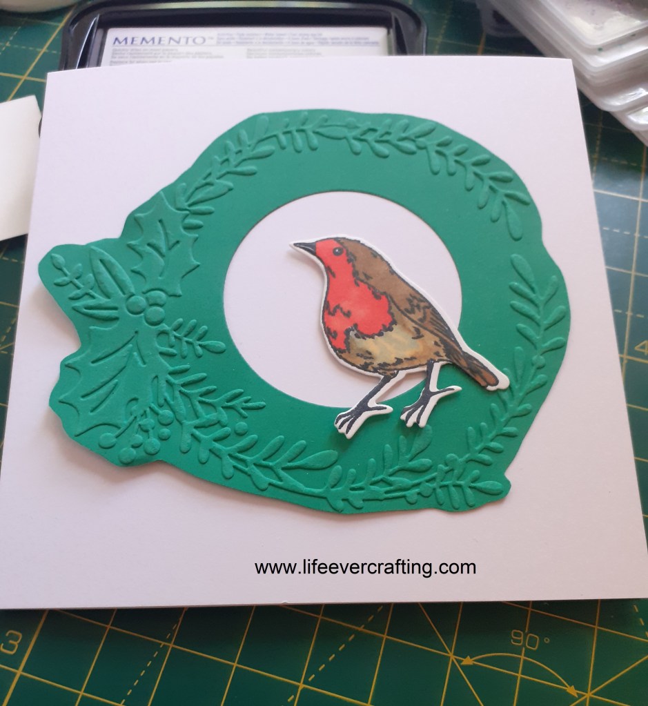 And found a different robin stamp and die pair to add one of them to the bottom of the wreath. This came from an RSPB winter birds set.