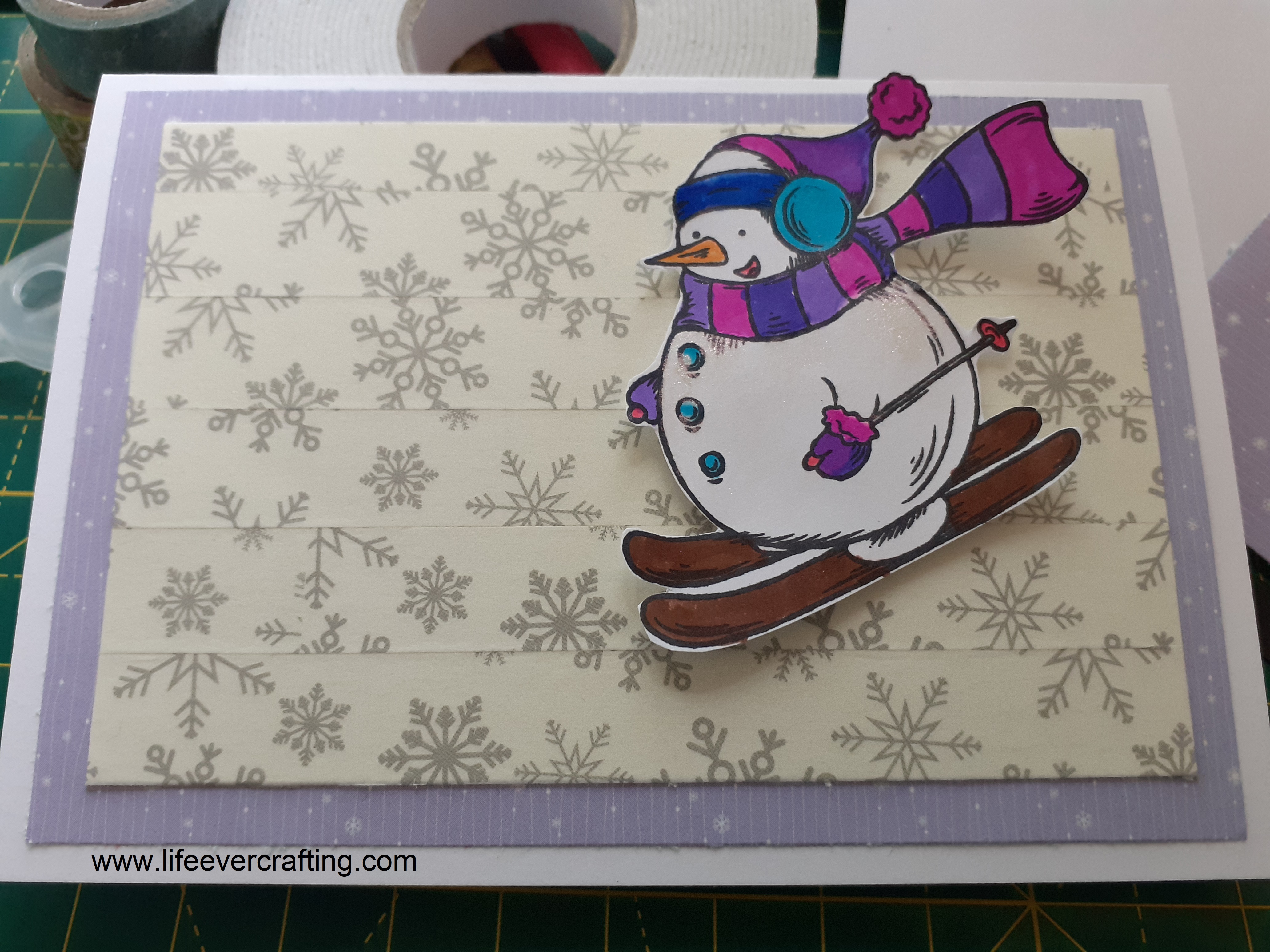 In the midst of this week’s heatwave, in trying to find a way to cool down, I couldn’t resist the skiing snowman from the Creative Stamping 100 set from Crafter’s Companion.