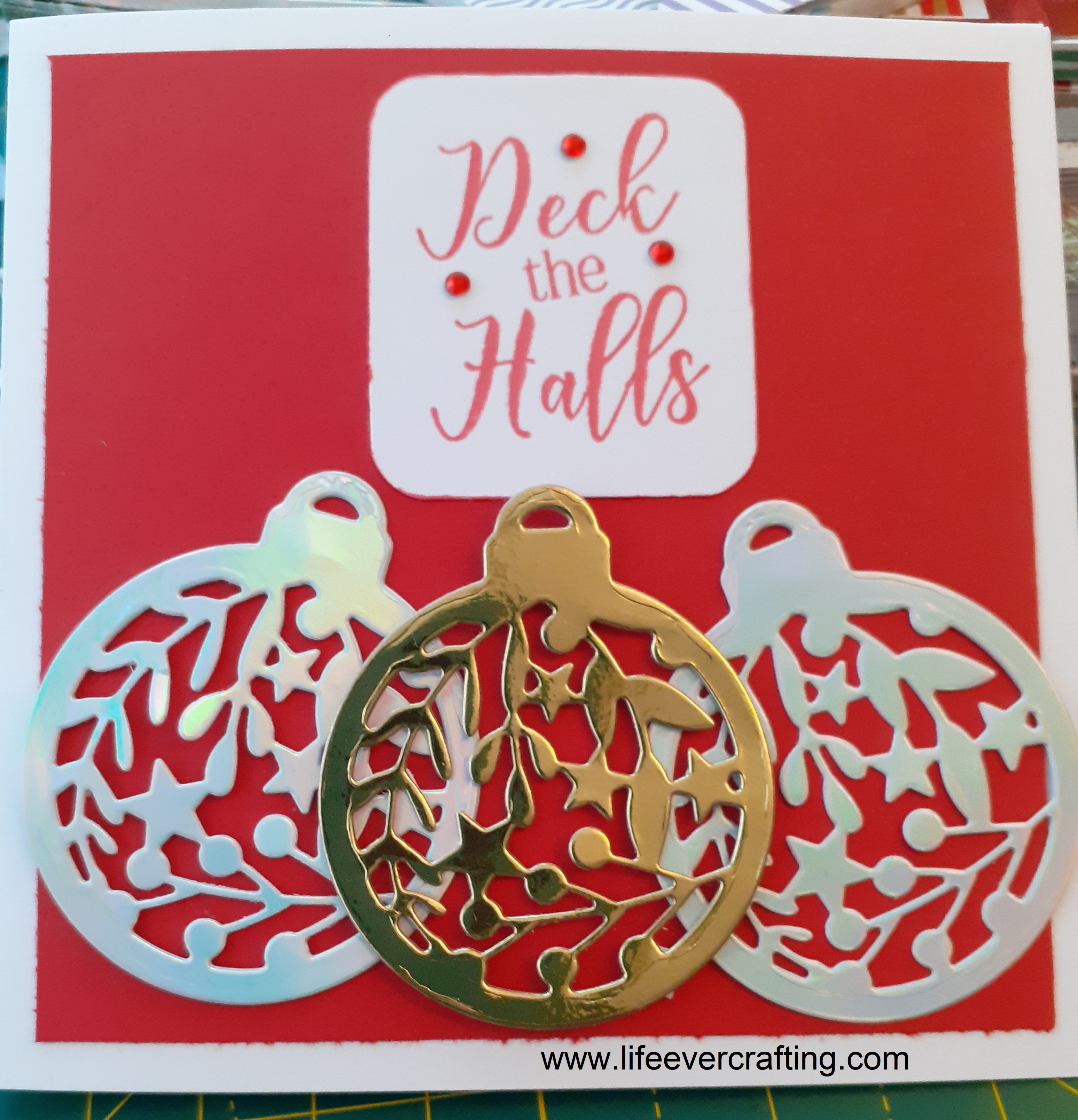 I thought I’d start small, and simple, with a bauble die cut in silver mirror card. And then, having cut out two, I decided that what I needed was a third, but in gold. The other thing that helped with this was the Cuttlebug, which I find far easier to use than my Gemini. Partly this is because I don’t have to organise any cables. The Cuttlebug just needs loading up with plates and it’s good to go.