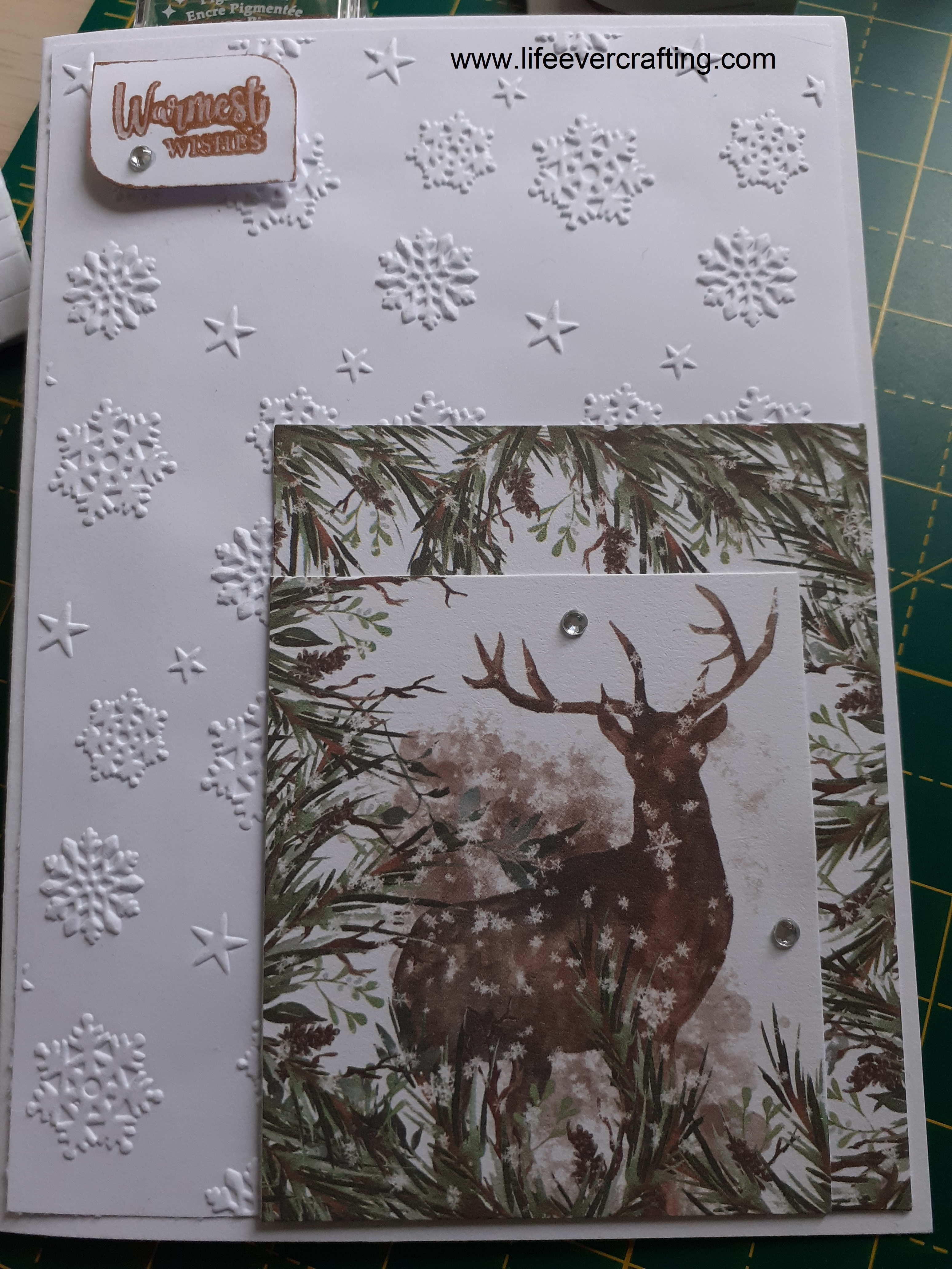 Given the snowflakes on the stag, I thought perhaps a snowy background would be suitable, and got the snowflake embossing folder out, along with the clear adhesive gems. Can’t have snow without a little sparkle.