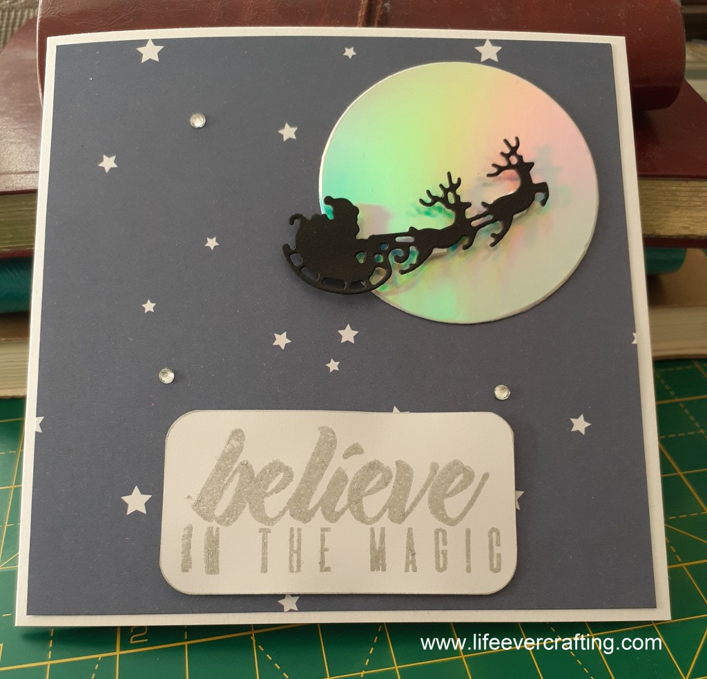 But I came up with something in the end: a silver moon with Fr Christmas and his sleigh travelling across a starry sky. The other bonus to this plan was using some of the patterned paper which also accumulates and never gets used.
