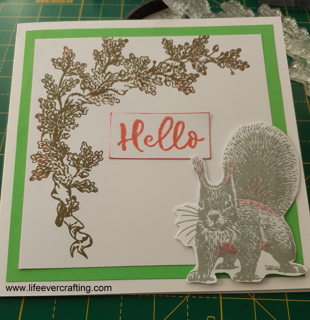 Initially, with the leaf stamp, I wasn’t sure how green to go, since autumn is normally characterised by yellow and orange leaves, and not so much the green. But the trees outside currently only have a few yellowing leaves. In the end, partly because the original green ink I was using needed a few applications, I decided to go over with an orange ink, to give it a tinge, and then a darker green. I think it’s turned out well. Better than the attempt at giving the grey squirrel coppery tinges around the edges did, anyway.