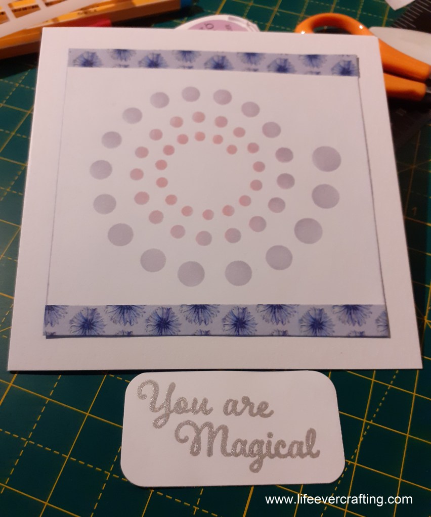 I did stamp a You are Magical sentiment, but then decided it was too big. It covered most of the pink circles and took up too much space. There’ll be some gems later, too. It seems to just call out for some sparkles and glitter.