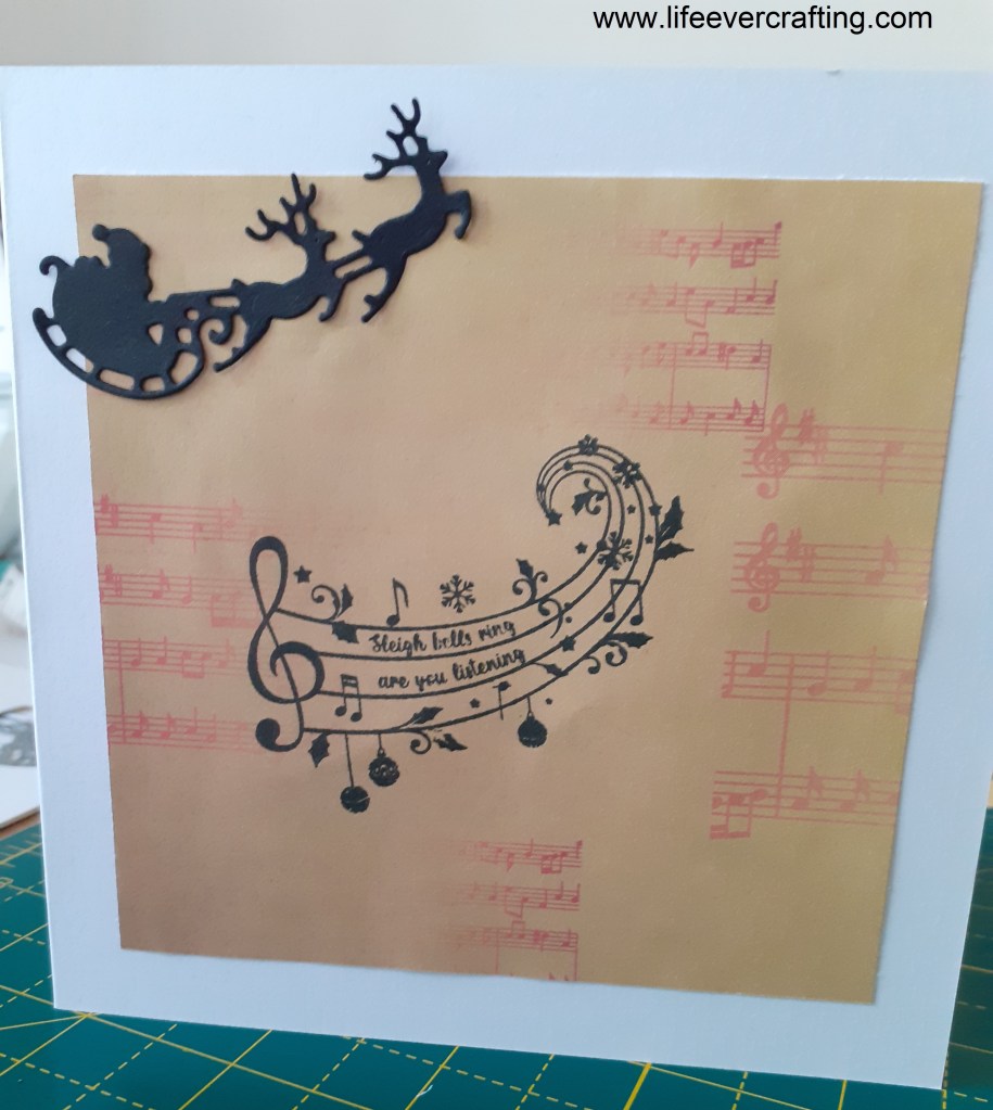 Same background paper, a musical stamp, and a sleigh die for the corner.