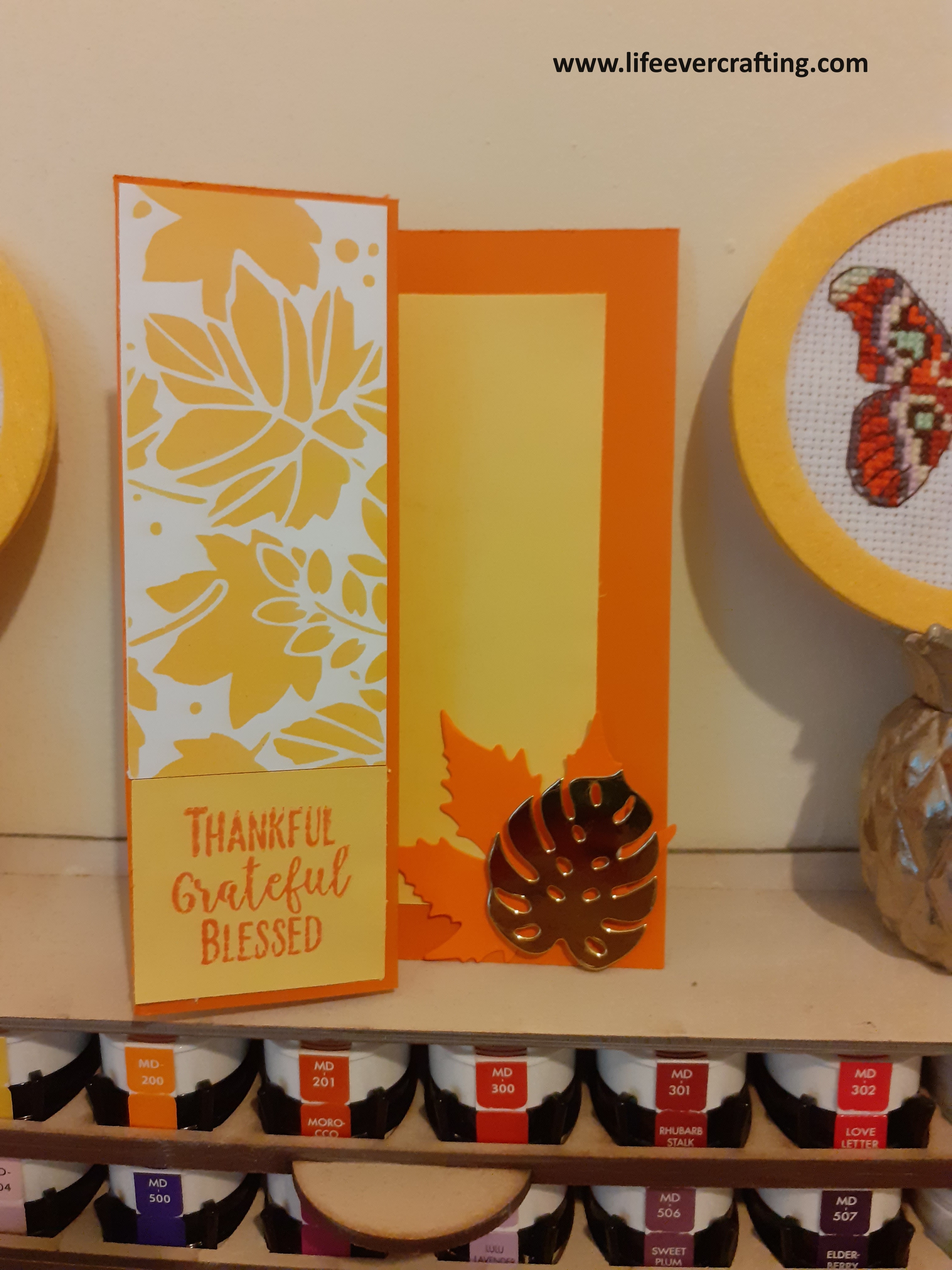 All you do is take a normal card base, and then score a line down the centre of the front of the card. So simple, so easy. Ideally, you’d then have the sentiment, or a focal image, stretching over the back of the card, but I was using up scraps, which fitted neatly on the space available. So I die-cut a couple of leaves for the bottom corner instead.