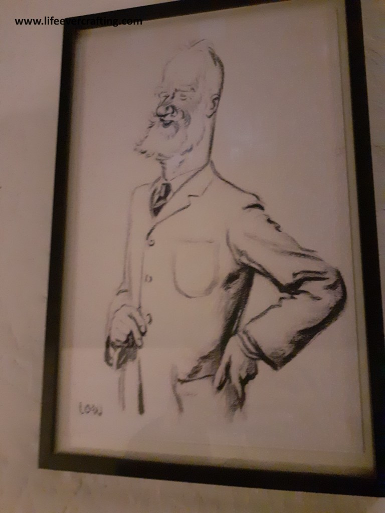 Imagine my surprise, and delight, therefore to happen unexpectedly across a set of Low caricatures when we visited Tredegar House, a Restoration-era mansion, last weekend. Hidden away down by the servants’ stairs, four portraits of HG Wells, Aldous Huxley, Augustus John, and one unnamed man whom the volunteer I asked about it didn’t know. I presume either a self-portrait (but it doesn’t look much like him from the photographs online), or one of the Morgan family – if anyone from the National Trust knows, or anyone else recognises this man, please let me know.