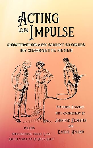 Acting on Impulse is a collection of her contemporary short stories, with one historical story, complete with introductions (by Jennifer Kloester) and commentaries (by Rachel Hyland). If you read the collection, I’d suggest ignoring the commentaries, which I didn’t feel really added anything beyond making me cross. A lot of vulgar speculation on personal life, which is and was nobody’s business but Heyer’s. As Heyer always maintained, giving no interviews (and no, it’s not fun, or polite, to speculate).