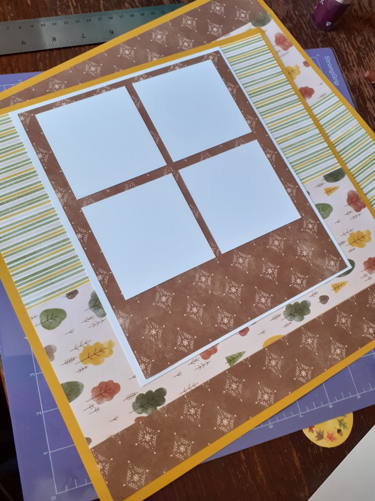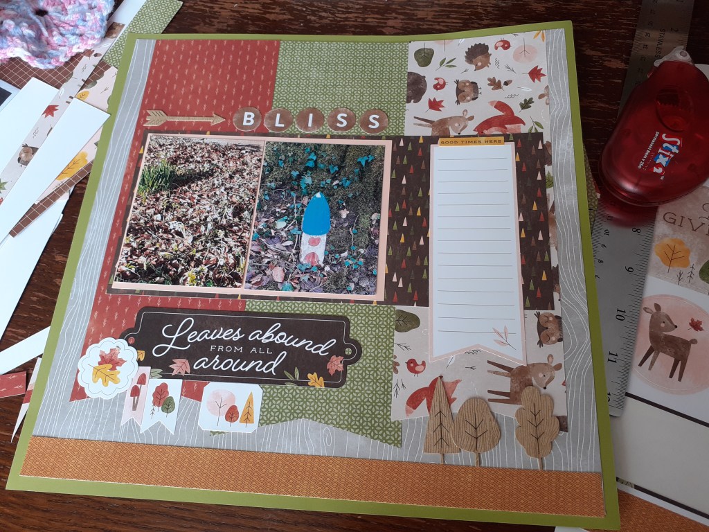 I spent a happy hour or so cutting up the papers per the instructions and cutting the photos down to size, and then spent moments during the week putting together at least the bases of each page. I haven’t yet stuck down all the photos, and therefore any embellishments which might be needed to go over said photos, or tucked behind them. That will probably happen in odd moments in the coming week.