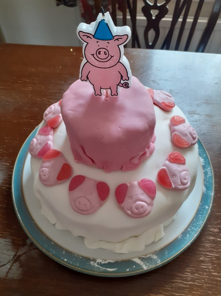 Instead, I made a three-layer sponge and cut a circle out of the centre of the top two layers to turn into a snout once I’d refilled the cake with whipped cream and Percy Piglets. Also because Tiny had insisted we get pink icing when we were fetching the last few ingredients. Fortunately only a small pack, but I still have at least half of it in my baking cupboard. Will have to think of something else pink to make with it.