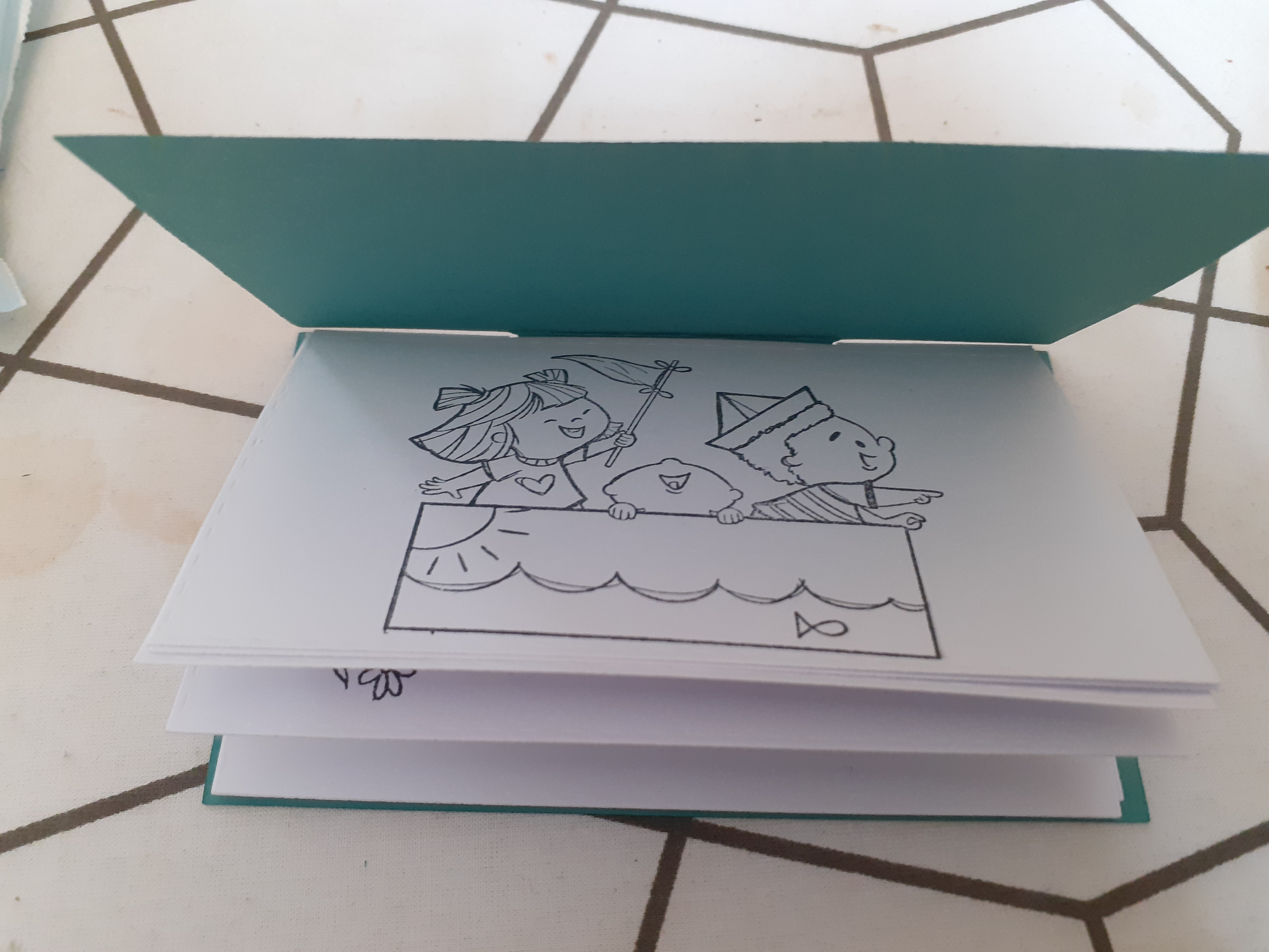 It’s a little smaller than the previous A5 sized books I’ve made, which probably means it will fit better with the small bag of colouring pencils and crayons. At some point I will make a proper little bag for all sorts of little distractions for when we’re out and about.